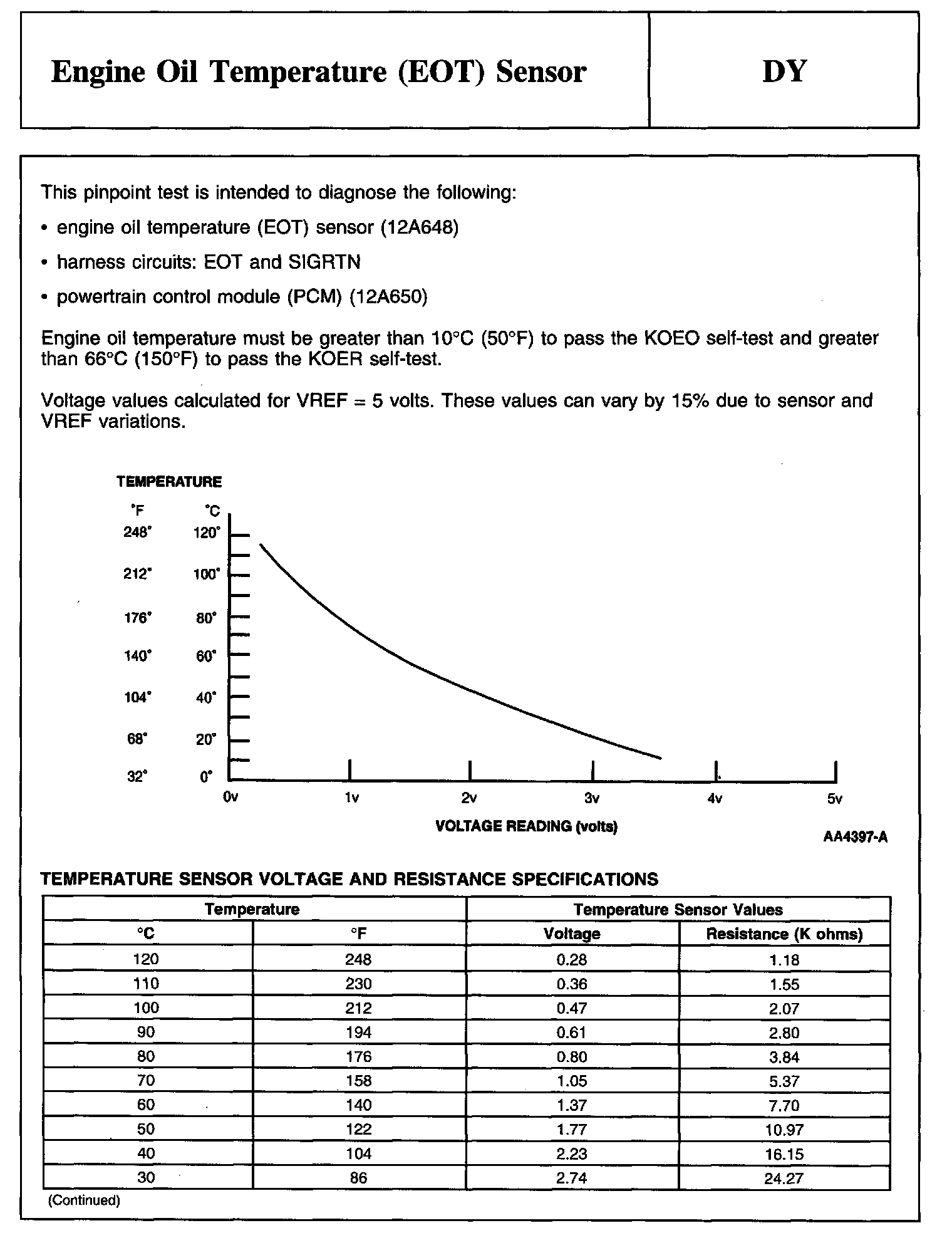 PINPOINT TEST DY: ENGINE OIL TEMPERATURE (EOT) SENSORDescription, Graph And Temperature Sensor Voltage And Resistance Specifications: