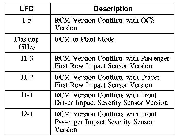 If the RCM receives conflicting information from the impact sensors or OCS system it will store DTC C1414 in memory and, depending on the fault, flash a LFC on the air bag warning indicator. The secondary air bag warning chime will also be activated.