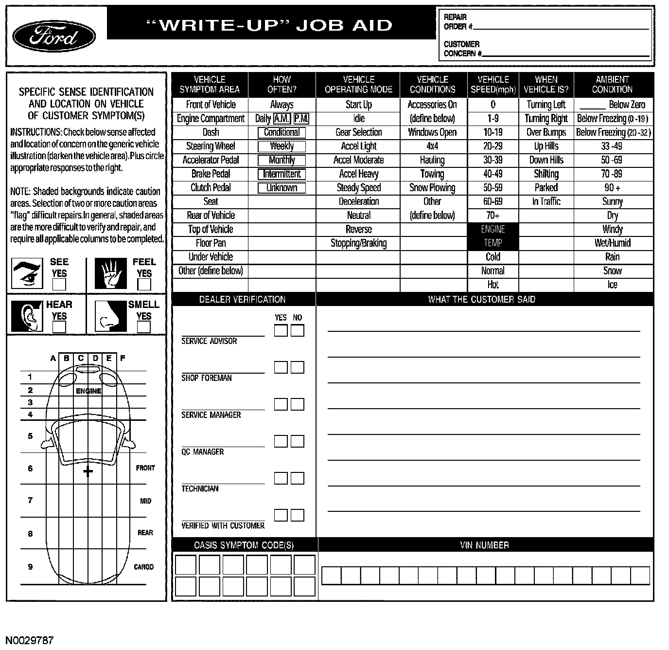 WRITE-UP JOB AIDTo assist the service advisor and the technician, a Write-Up Job Aid used during the interview process is included with this material. The Write-Up Job Aid serves as a place to record all important symptom information.