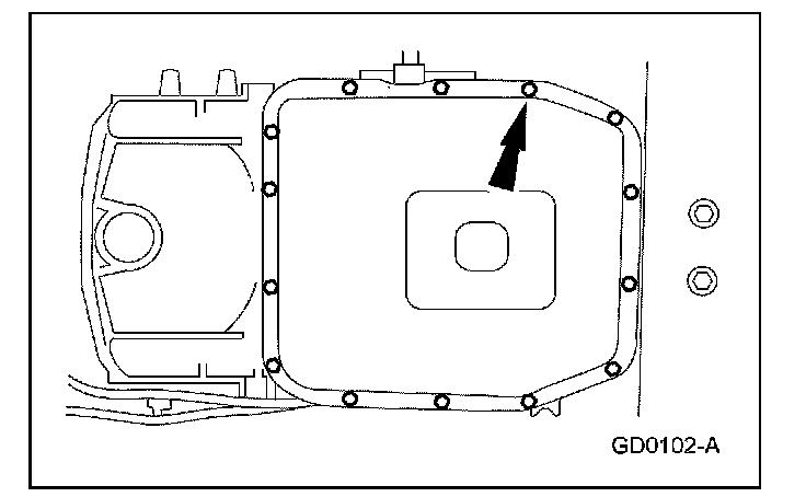 ^ Loosen the transmission fluid pan bolts and allow transmission fluid to drain. After the transmission fluid has drained, remove the bolts.