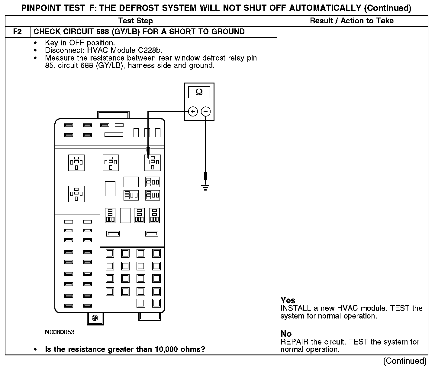 The heated rear window is controlled by the HVAC module. The ignition switch must be in RUN for the rear window defrost system to operate. When the rear window defrost button is pressed, the HVAC provides a ground for the rear window defrost relay coil through circuit 688 (GY/LB). The rear window defrost relay coil is energized, providing battery voltage to the antenna module on circuit 186 (BN/LB). The antenna module then supplies voltage and ground to the heated rear window grid.