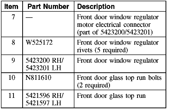 8. CAUTION: Prior to removing the rivet center pins, it is necessary to place a suitable block support between the door outer panel and the door window channel bracket to stabilize the door window glass during rivet removal.