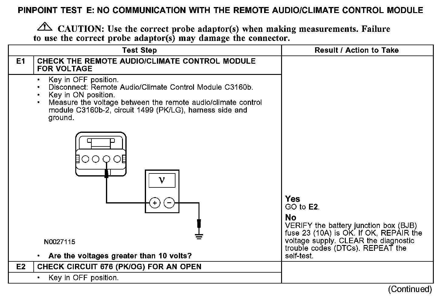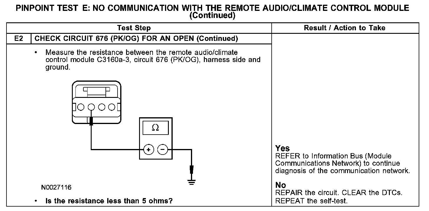 PINPOINT TEST E: NO COMMUNICATION WITH THE REMOTE AUDIO/CLIMATE CONTROL MODULEE1-E2: