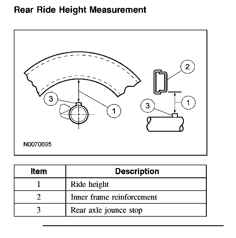 Rear Ride Height MeasurementNOTE: Make sure that the vehicle is positioned on a flat, level surface and the tires are inflated to the correct pressure. Vehicle should have a full tank of fuel.