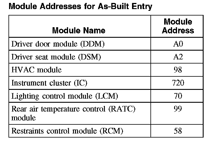 The following chart lists module As-Built data addresses: