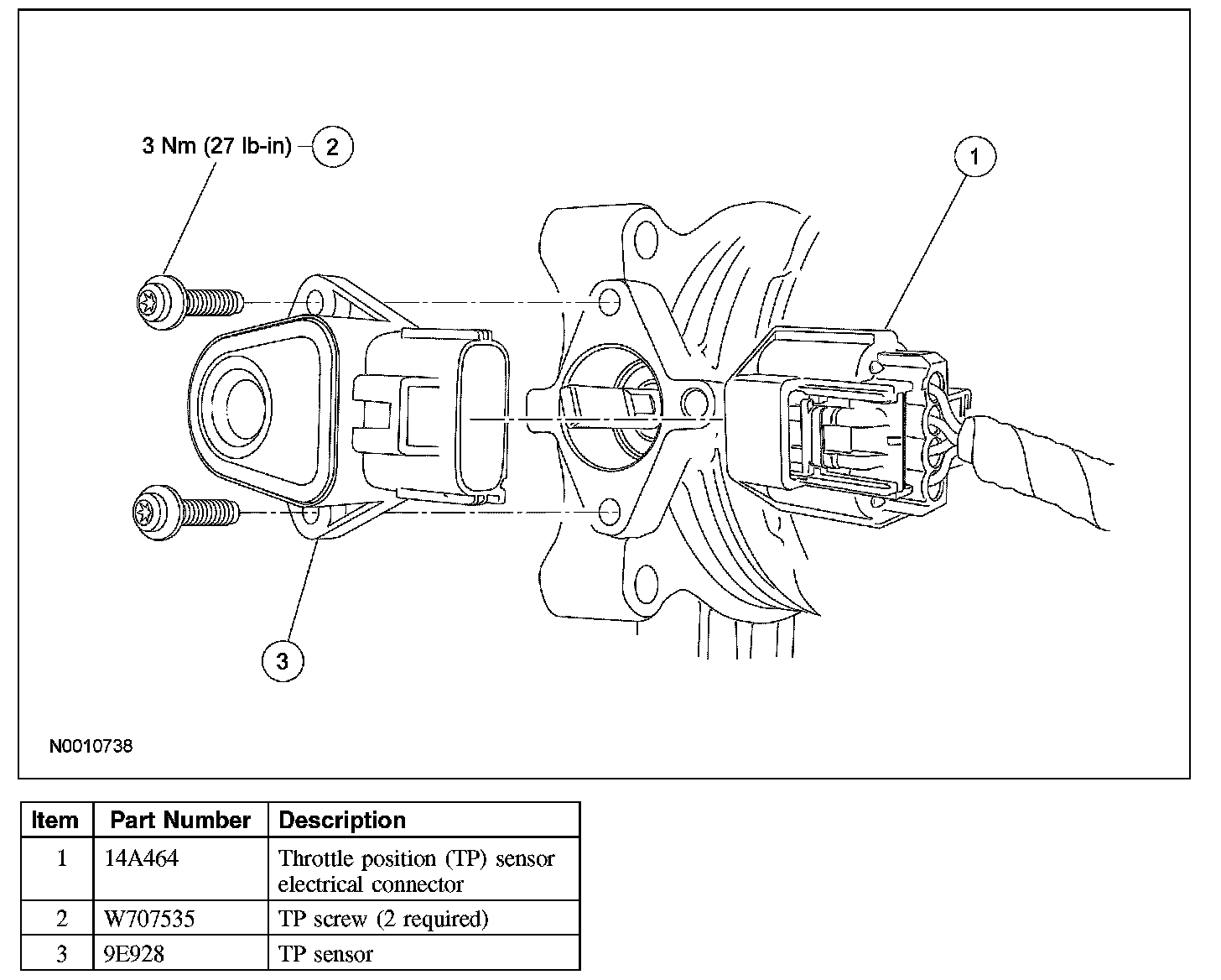 - When installing the new TP sensor, make sure that the radial locator tab on the TP sensor is aligned with the radial locator hole on the throttle body.