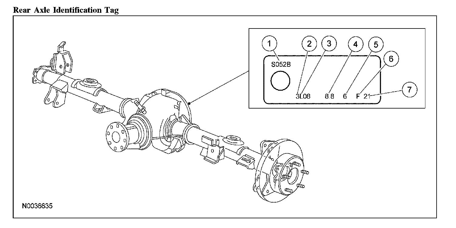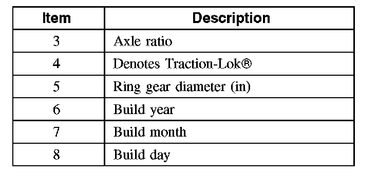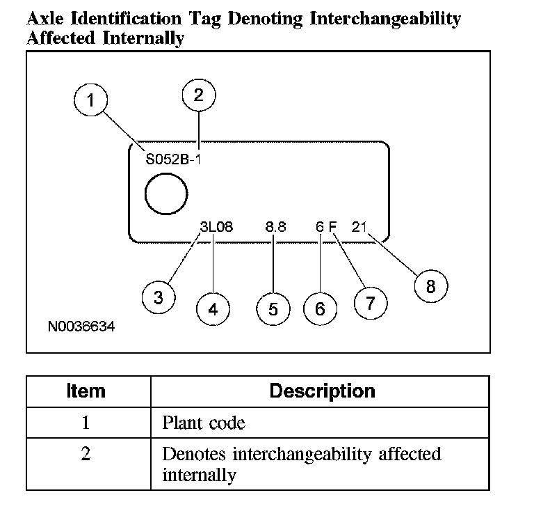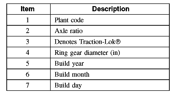 The axle identification tag identifies a particular axle design, a specific ratio and if it is a conventional or limited slip (Traction-Lok) type. In addition, the plant code will not change as long as that particular axle assembly never undergoes an external design change. If, however, an internal design change takes place during the production life of the axle and that internal change affects parts interchangeability, a dash and numerical suffix is added to the plant code. This means that as an assembly both axles are interchangeable; however, internally they are different. Therefore, each requires different internal parts at the time of repair.
