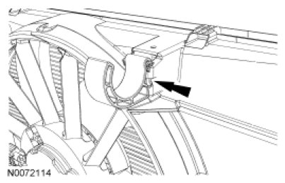 3. Disconnect the cooling fan motor electrical connector and detach the 5 wiring harness retainers from the shroud.