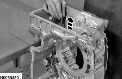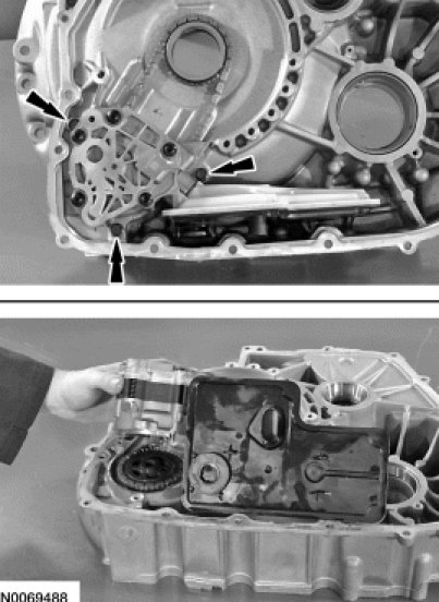 45. NOTICE: Carefully pry on the transaxle torque converter housing and the case to separate the torque converter housing from the case. Do not pry up on the silicone sealant mating surfaces, damage to the mating surfaces may occur. Carefully lift the torque converter housing off the dowel pins.