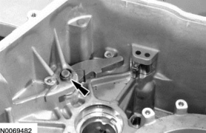 67. Remove the bolt and the fluid baffle from the torque converter housing.