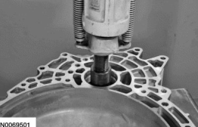 81. Using a suitable press, press the differential bearing cup out of the torque converter housing.
