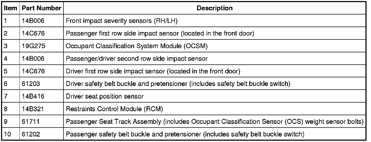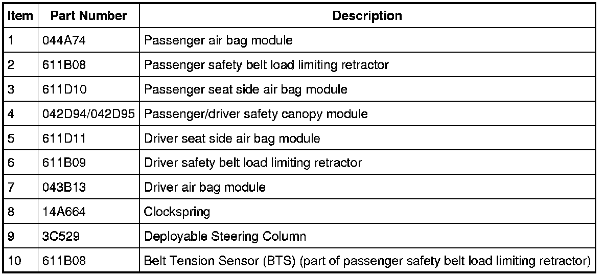 The serviceable air bag and safety belt pretensioner SRS components are shown in the following illustrations.