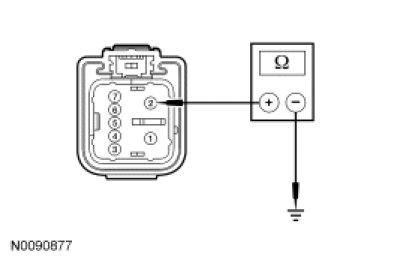 - Measure the resistance between RH front window motor C608-5, circuit CPW12 (GN/OG), harness side and LH front window control switch C504-10, circuit CPW12 (GN/OG), harness side.