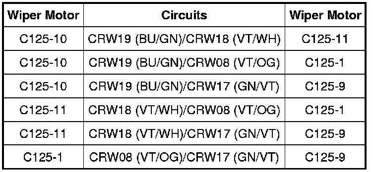 - Measure the resistance between wiper motor C125, harness side, using the following chart: