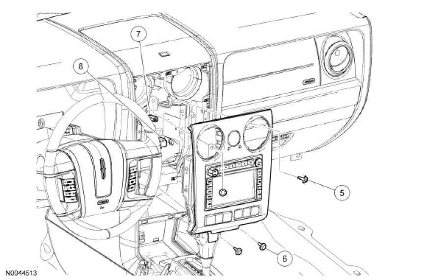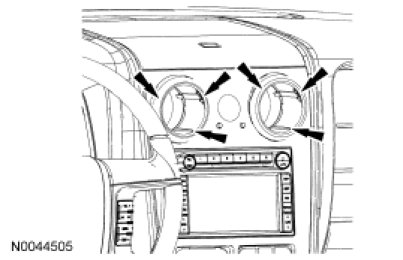 5. NOTICE: Close the ash receptacle door and pull gently, starting at the bottom of the bezel, in order to disengage the clips. Failure to follow this instruction may result in damage to the climate control and bezel assembly.