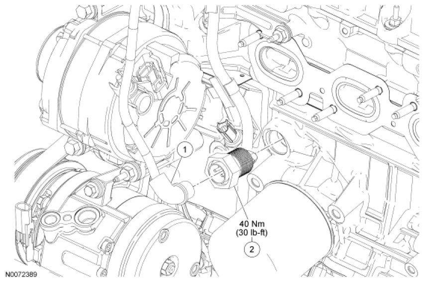- To install, tighten to 40 Nm (30 lb-ft) (3.0L and 3.5L).