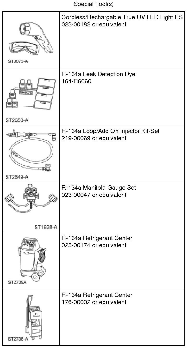 NOTE: Fluorescent refrigerant system dye is added to the refrigerant system at the factory to assist in refrigerant system leak diagnosis using a Rotunda-approved ultraviolet blacklight. It is not necessary to add additional dye to the refrigerant system before diagnosing leaks, even if a significant amount of refrigerant has been removed from the system. Additional refrigerant system dye should only be added if more than 50% of the refrigerant system lubricant capacity has been lost due to a fitting separation, hose rupture or other damage.