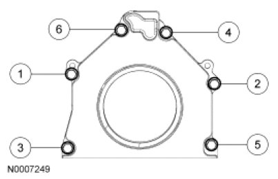 114. Tighten the 6 crankshaft rear seal retainer plate bolts in the sequence shown.