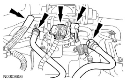 99. Position the vacuum harness and connect the vacuum hoses for the Evaporative Emission (EVAP) canister purge valve, the main chassis hose and the EGR valve.