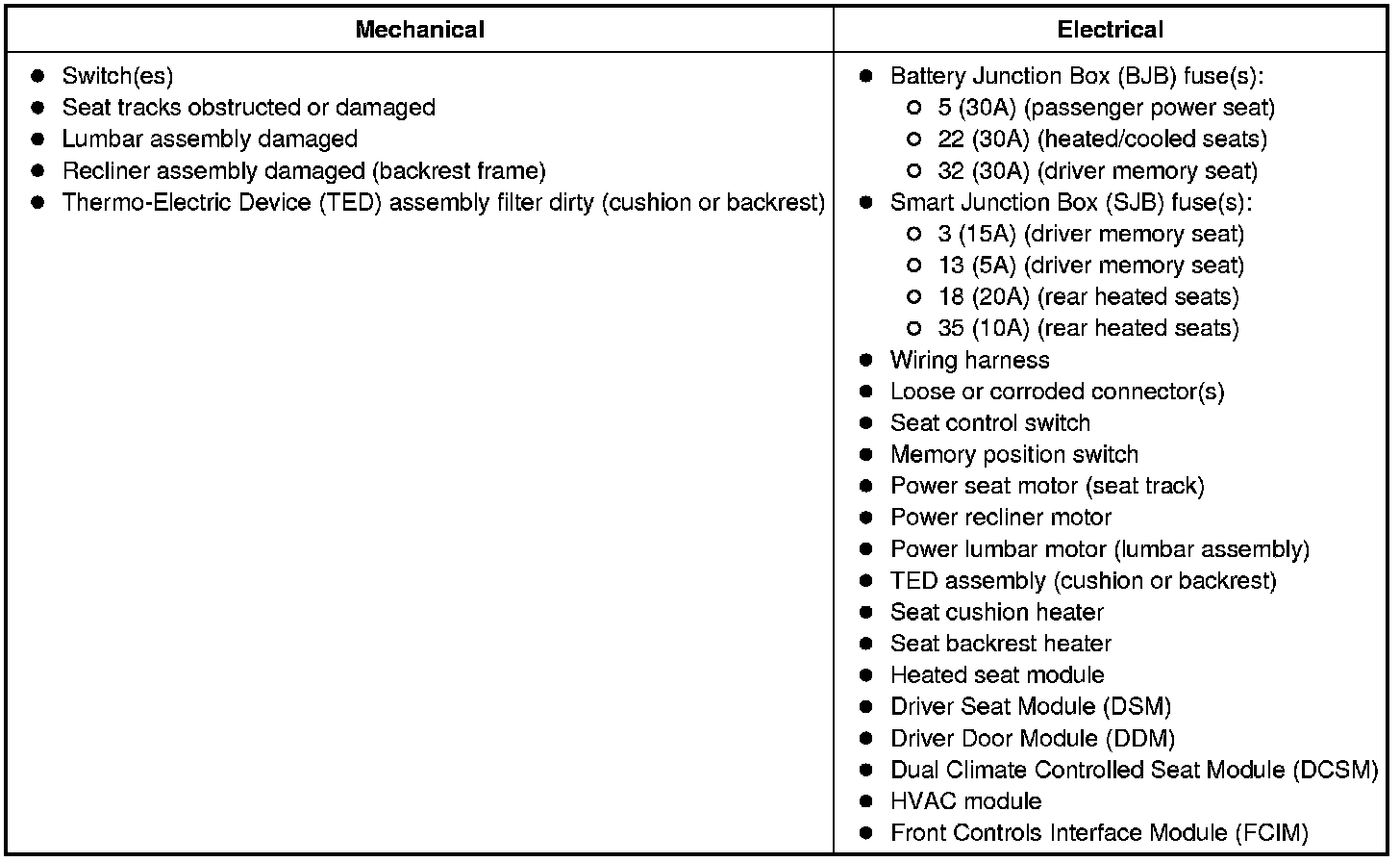 4. If the concern is with the power seat (non-memory seat) or heated seat and the cause is not visually evident, verify the symptom and GO to Symptom Chart. Symptom Related Diagnostic Procedures