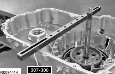 42. Using a suitable depth gauge, measure and record as measurement A, the distance from the top of Shim Selection Gauge 307-300 to the contact surface of the low/reverse clutch piston.