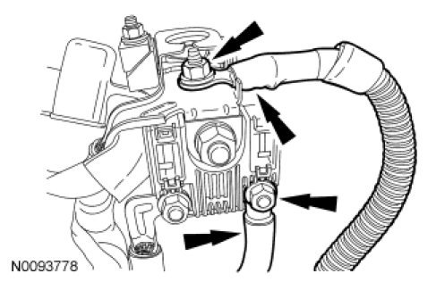 14. Remove the 2 nuts and the battery cables from the positive battery cable.