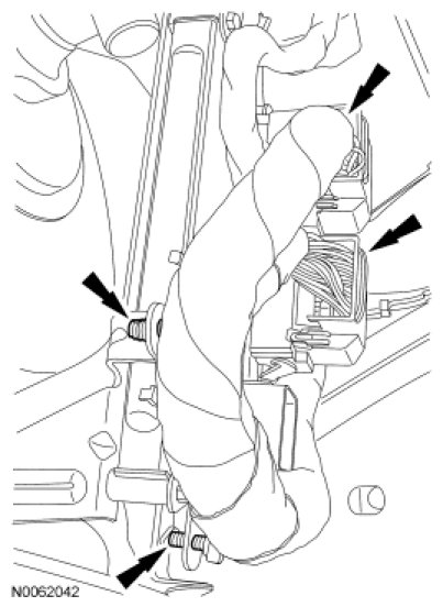 13. Detach the 2 wiring harness retainers from transmission mount and the battery tray bracket.