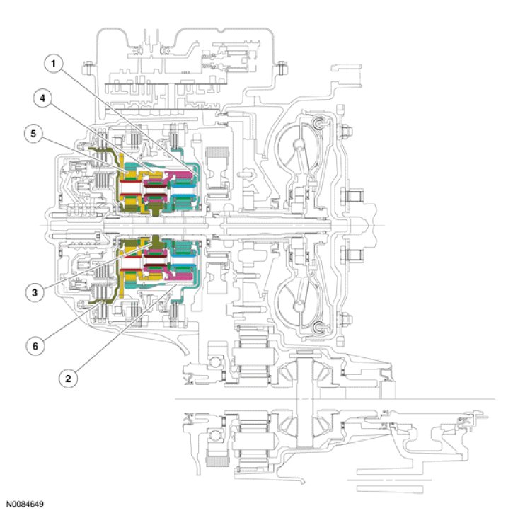 The rear planetary sun gear and shell assembly is splined to both the intermediate (2, 6) clutch and the direct (3, 5, R) clutch. The rear planetary sun gear and shell assembly is held stationary by the intermediate (2, 6) clutch in 2nd and 6th gear and is driven by the direct (3, 5, R) clutch in 3rd and 5th gears and reverse.