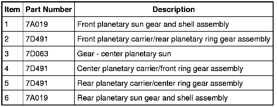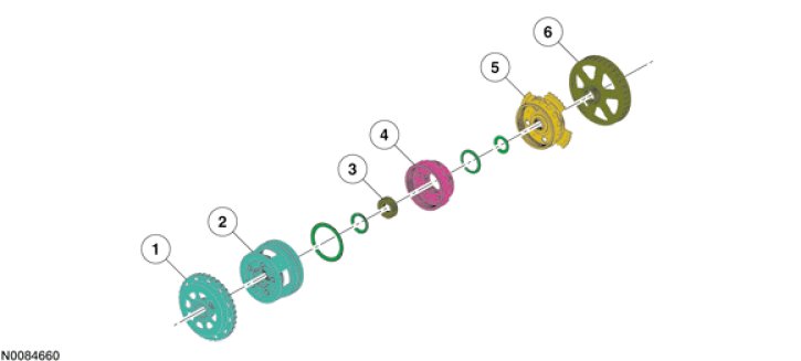 The center planetary ring gear is splined to the rear planetary carrier and transfers power from the center planetary gearset to the rear planetary gearset in 3rd gear, from the rear planetary gearset to the center planetary gearset in 4th gear and is held stationary by the low One-Way Clutch (OWC) and low/reverse clutch in 1st gear and reverse.