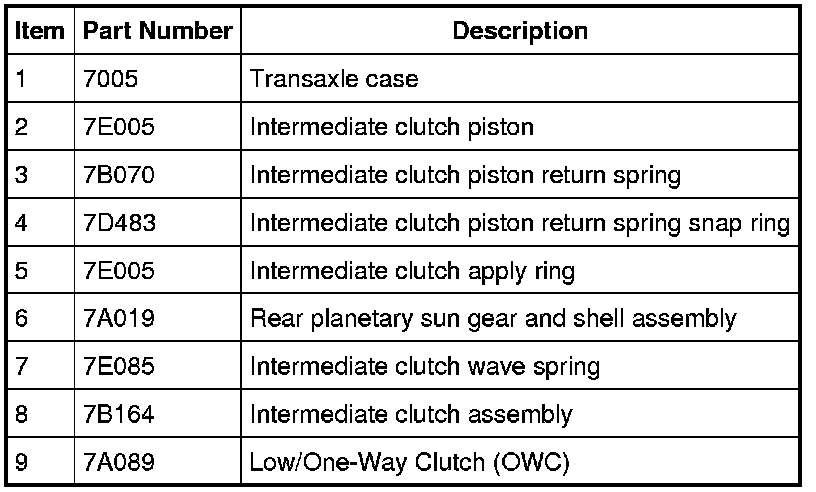 Hydraulic pressure from the regulator valve in the valve body pushes the intermediate clutch piston against the intermediate clutch pack to apply the clutch. The low OWC works as a pressure plate for the intermediate (2, 6) clutch. The rear planetary sun gear and shell assembly is held stationary to the transaxle case as a result of the clutch being applied.