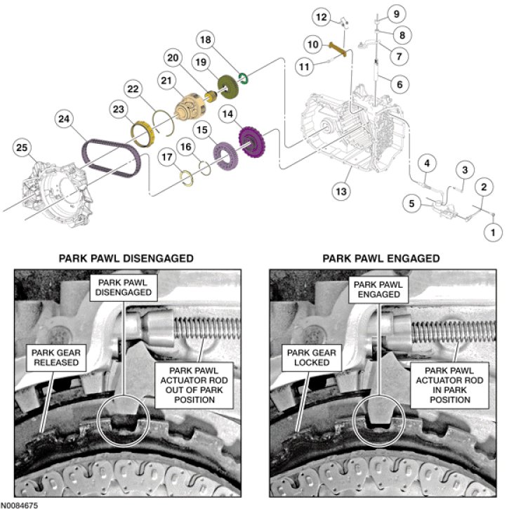 - The actuator rod pivots the park pawl into the lugs on the park gear, locking the gear stationary to the transaxle case.
