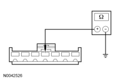 - Measure the resistance between interior mirror C911-5, circuit 47 (LB/WH), harness side and LH exterior mirror C516-7, circuit 47 (LB/WH), harness side.