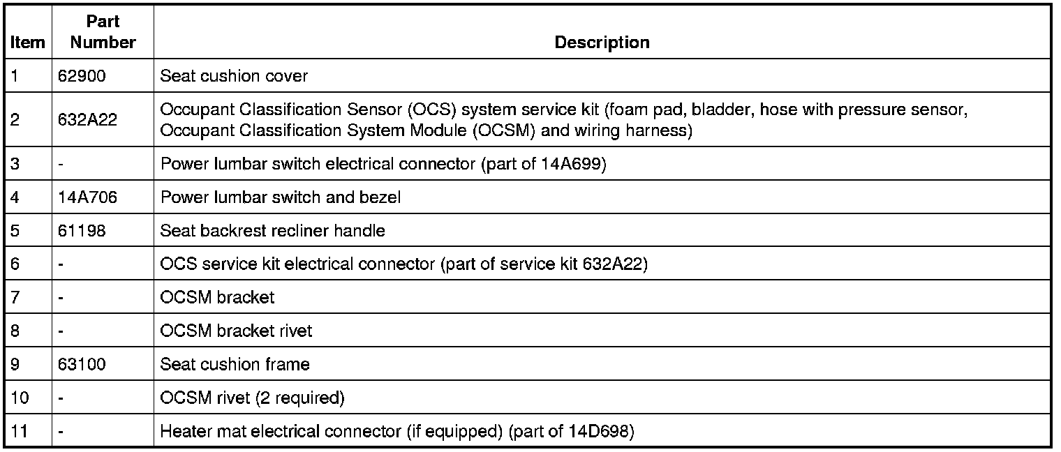 WARNING: Install a new occupant classification sensor (OCS) system service kit as a complete assembly. Never install only part of the kit components. Failure to follow this instruction may result in incorrect operation of the OCS system and increases the risk of serious personal injury or death in a crash.