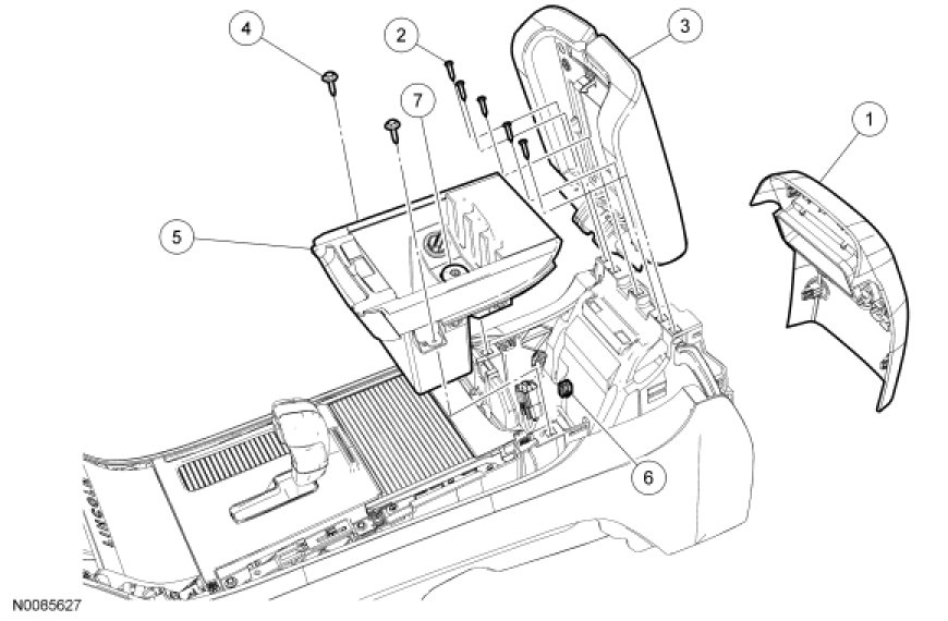 4. NOTE: Release the rear clips of the LH and RH floor console upper trim panels (located along the top-outer edges of the floor console) to gain access to the floor console stowage bin screws.