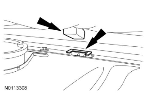 5. NOTE: During installation, make sure that the foam blocks on the parcel shelf are engaged on the sunshade tabs. RH side shown LH side similar.