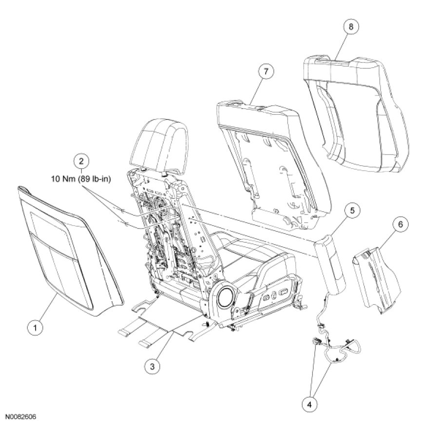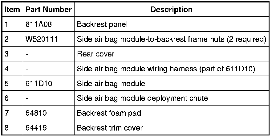 NOTE: If a side air bag deployment took place, a new seat backrest pad, trim cover and side air bag module must be installed. The seat backrest frame should be installed new if necessary. Refer to Seating Seat - Exploded View, Front for additional information concerning new seat backrest installation.