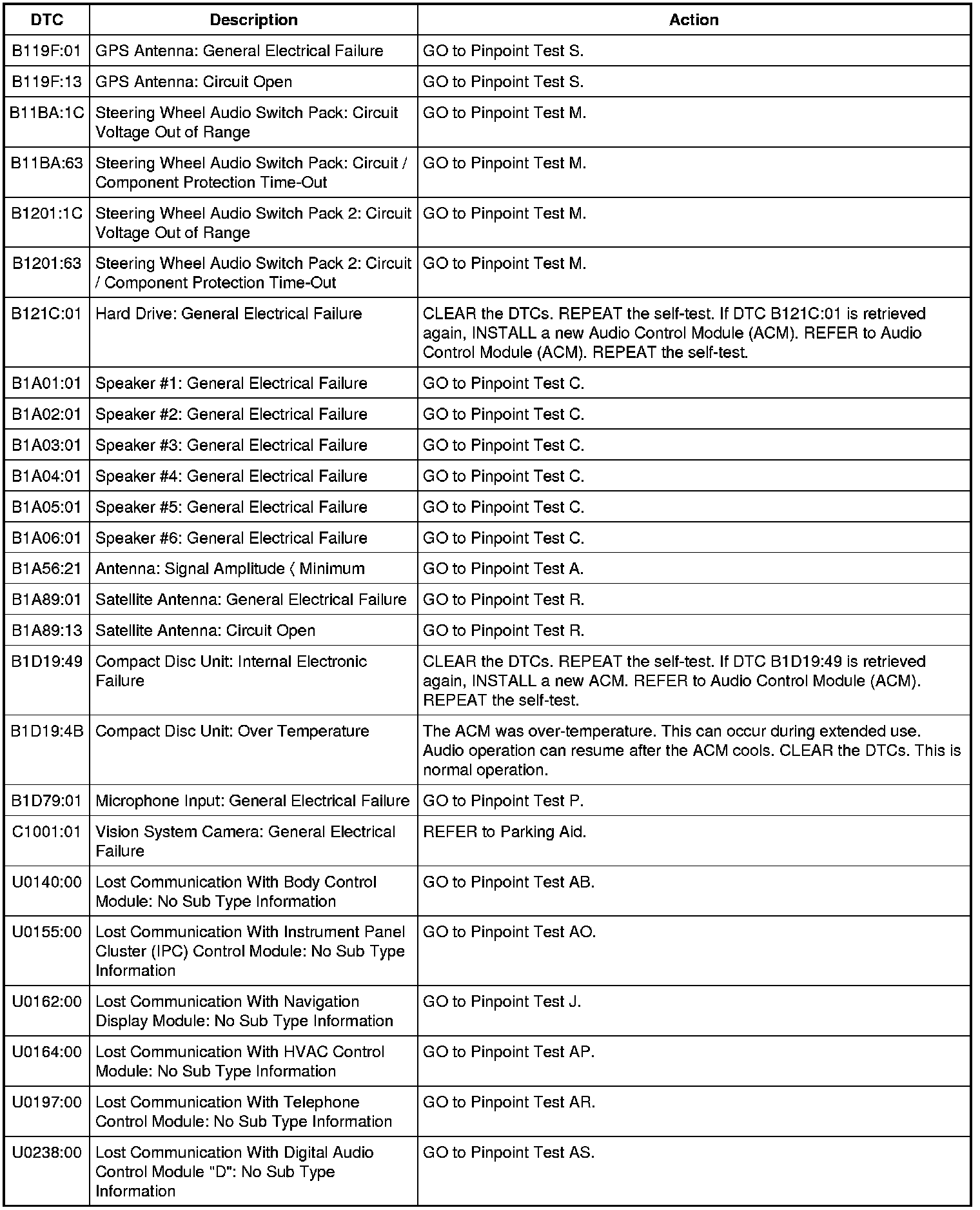 Audio Control Module (ACM) DTC Chart