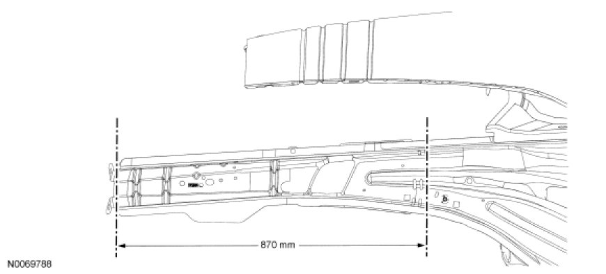 Scribe a cut-line 870 mm (34.25 in) from the front bumper bracket on the outer frame rail. Using a plasma cutter, cut-off wheel or reciprocating saw, cut off the front rail inner and outer assemblies along the scribe line.