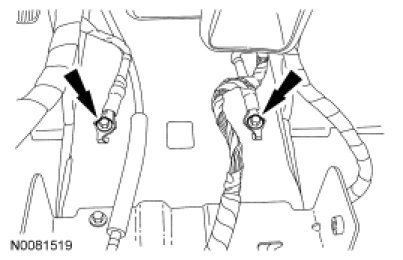 33. Remove the 2 bolts and the ground wires from the floor pan tunnel.