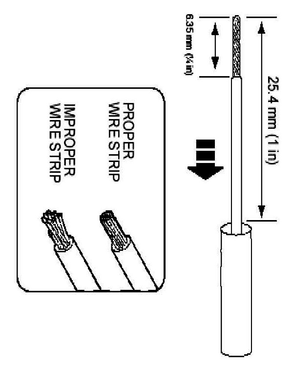 2. Strip 6.35mm (1/4 in) of insulation from each wire end, taking care not to nick or cut wire strands.