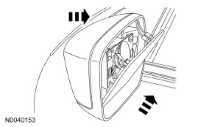 Place a hand against the back of the exterior mirror and a hand flat against the upper exterior mirror glass and press the exterior mirror glass into the upper exterior mirror motor retainers.