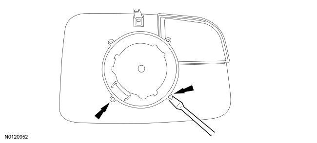 Using the thin, flat-blade screwdriver, remove the exterior mirror glass by releasing the tabs. Starting at the lower outboard side of the mirror and continuing to the lower inboard side.