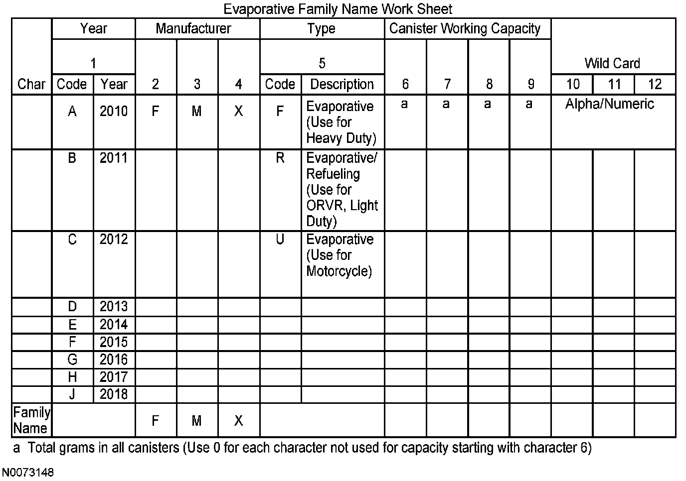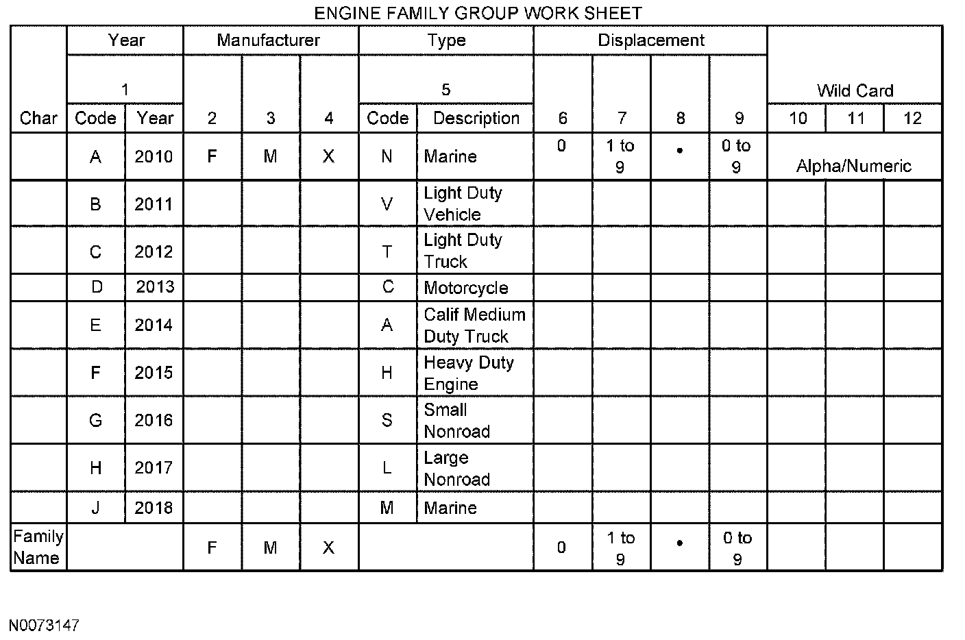 Manufacturers must use a standardized system for identifying their individual engine families. The engine family group and the evaporative family name consists of 12 characters each.