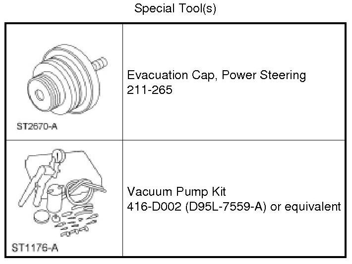 12. Install the Power Steering Evacuation Cap and the Vacuum Pump Kit. Apply and maintain the maximum vacuum of 68-85 kPa (20-25 in-Hg).