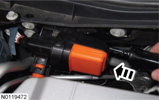 10. Push the retainer rearward to remove the high voltage junction box and position the high voltage junction box aside.