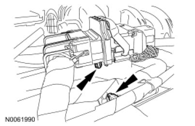 72. Attach the 2 wiring harness retainers to the transmission mount and the battery tray bracket.