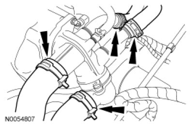 68. Connect the upper radiator hose, lower radiator hose and 2 heater hoses to the thermostat housing.