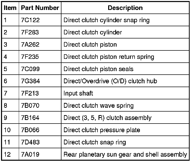 The direct clutch is a drive clutch that transfers power from the direct/O/D clutch hub assembly to the rear planetary sun gear and shell assembly. The direct clutch is applied in 3rd and 5th gears and reverse.
