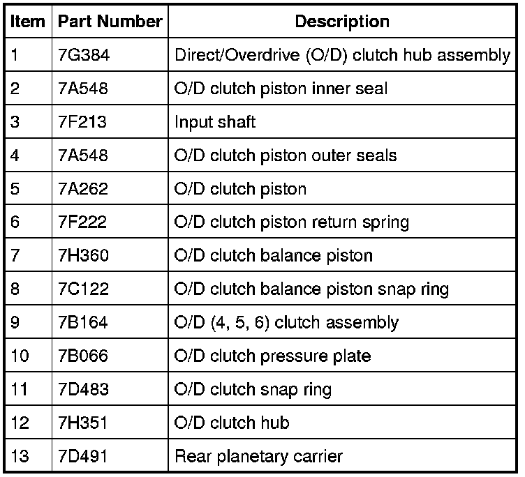 The O/D clutch is a drive clutch that transfers power from the direct/O/D clutch hub assembly to the rear planetary carrier. The O/D clutch is applied in 4th, 5th and 6th gears.