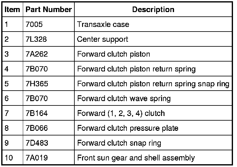 The forward clutch is a brake clutch that holds the front sun gear and shell assembly. The forward clutch is applied in 1st, 2nd, 3rd and 4th gears.